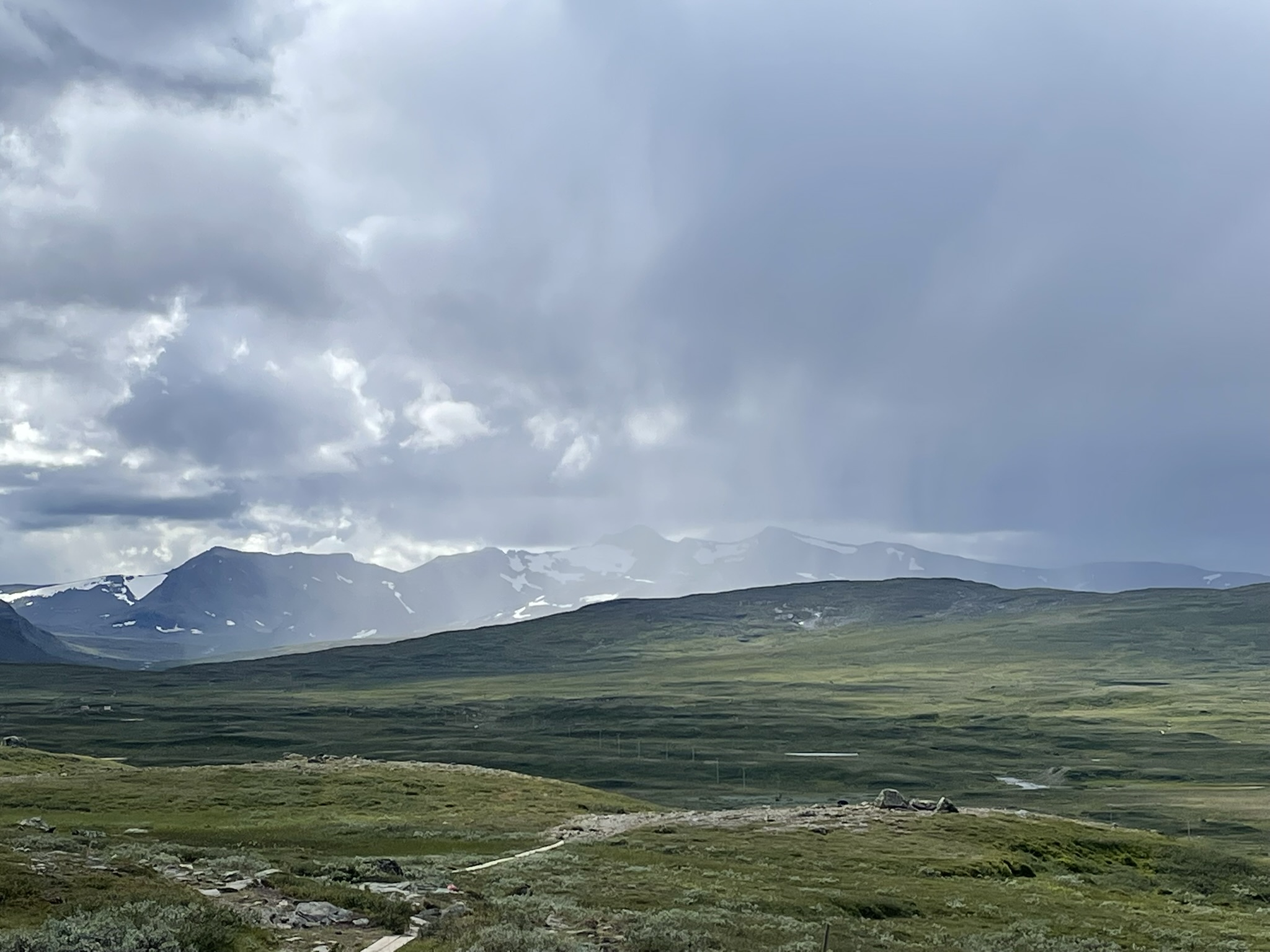 | Tourstart nach Maß: Es regnet. Nach einem steilen Anstieg ab Storulvan kommt man über die Baumgrenze und atmet das Fjäll. | |||